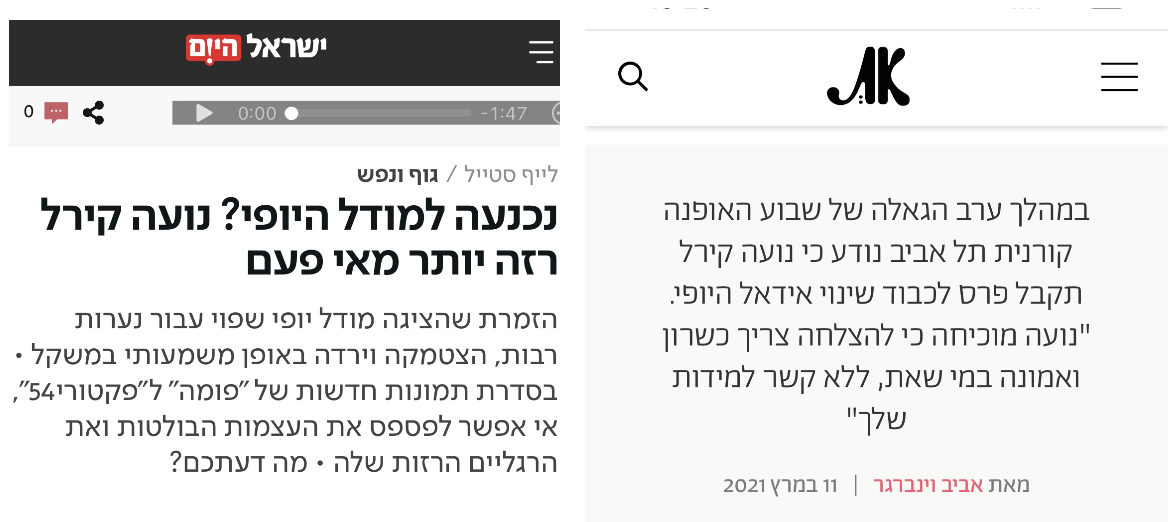 נועה קירל שהפכה למלכת הפופ הישראלית, החלה את דרכה בגיל צעיר והצליחה למתג ולמנף את עצמה שנים רבות בעזרת אותן פרובוקציות. בגיל 14 העלתה קליפ הנפתח בגניחה ולאחריו המשפט״ מה המספר האהוב עליך? שלי 69״. נועה במשך כמה שנים שימשה דוגמה משמעותית לילדות רבות בעקבות מבנה הגוף שלה שבשונה משאר הזמרות היה בריא ולא אנורקטי. לפני כשנה וחצי היא זכתה בפרס לשינוי אידאל היופי. לא האמנתי שזו תהיה סנונית ראשונה ואשר בעקבותיה יגיעו מפורסמים אחרים ויצטרפו למהלך. וכעבור שנה, הלך ונעלם לו אידאל היופי ואיתה גם המודל לחיקוי והזמרת המפורסמת שהצהירה שהיא לא זקוקה לצילומים בביקיני כד להתפרסם, השילה משקל רב מגופה ופרסמה סדרת צילומים של רזון קיצוני בביקיני כמובן. לא היו בי ציפיות אחרות מאחר וכל התעשייה הזו בנויה על שקר והונאה אחת גדול